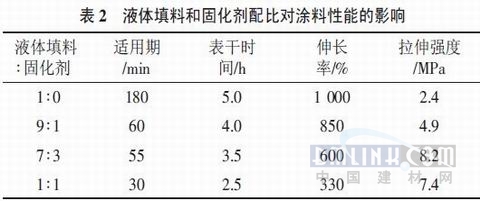 高。随着—NCO和活性H物质的量比增加,硬段含量增加、大分子的刚性增大、氢键密度增大,分子间作用力增大,聚氨酯分子链间物理交联点的密度也增加,从而使拉伸强度、延伸率和撕裂强度增大;随着—NCO和活性H物质的量比的继续增加,硬段的含量过多,氨酯键和脲键的密度过大,虽然其拉伸强度和撕裂强度会有所提高,但是聚氨酯分子链间作用力增大使分子链的运动受阻、柔性降低,涂膜的硬度增大、断裂伸长率有所下降,同时涂料的施工性及流平性不好。若超过一定比值时,涂膜发脆,气泡和针孔增多;同时游离的—NCO基含量增加,游离单体的挥发使人体受到伤害。因此,—NCO和活性H物质的量比不宜过高,综合对比当—NCO和活性H物质的量比在1.1时综合性能优。 3.3液体填料和固化剂配比对涂料性能的影响 液体填料一方面可以参与交联反应,另一方面可以帮助润湿填料起到降低聚氨酯防水涂料黏度的作用。液体填料和固化剂的合适配比(物质的量比)不但能保证聚氨酯防水涂料有较好的施工黏度而且能保证其有较优的综合性能。液体填料和固化剂配比的不同对聚氨酯防水涂料综合性能的影响见表2。